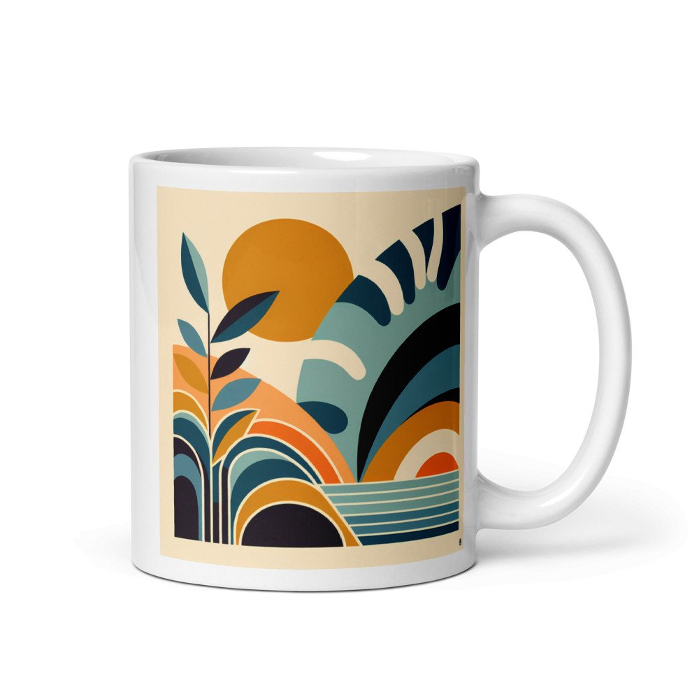 The glossy ceramic surface allows the warm botanical composition to wrap seamlessly around this dishwasher-safe mug. Enjoy the balanced interplay of geometric leaves and sun shapes in teal and peach with every drink, their clean forms suiting the vessel's simple shape.