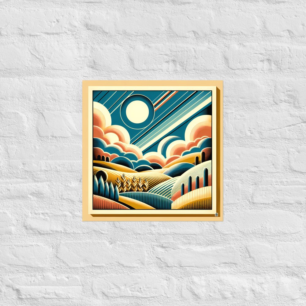 Retro Geometric Sun and Clouds Over Rolling Hills — Poster