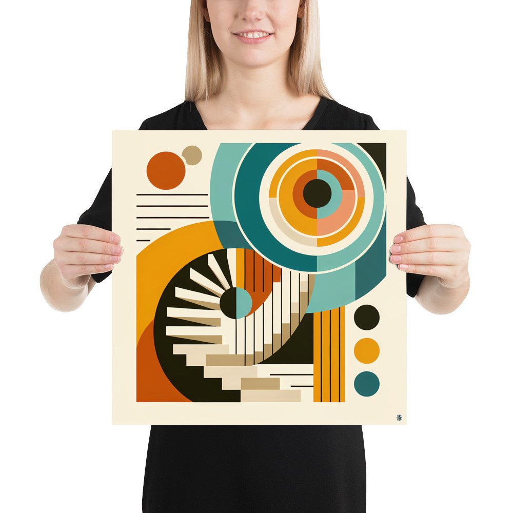 Abstract geometric composition featuring layered concentric circles, bold arcs, and a stylised staircase form. Clean lines and segmented shapes create a modernist, mid-century inspired layout. A warm and cool palette of teal, mustard, rust, cream, and black adds strong contrast and balance.