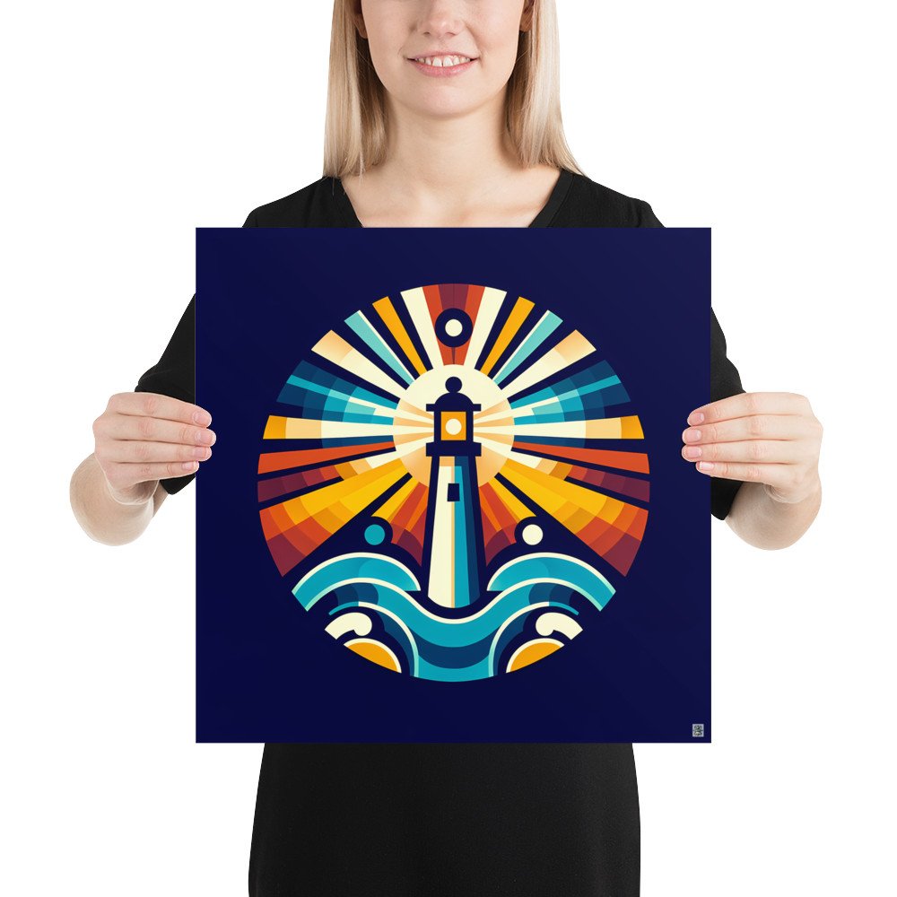 A bold lighthouse stands centred against a radiant sunburst of layered rays in warm oranges, reds, and cool blues. Stylised ocean waves curl beneath in clean geometric shapes. The design uses strong symmetry, crisp edges, and a deep navy backdrop for high contrast.
