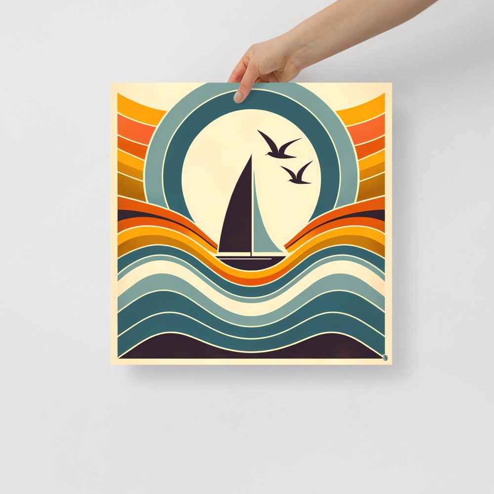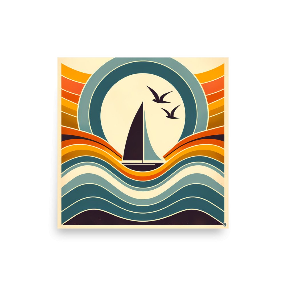 A minimal sailboat silhouette glides across layered waves beneath a bold circular sun, with two birds in flight. Curved bands in teal, beige, and warm orange create a clean, retro-inspired composition. A calm neutral abstract look with simple geometric shapes that nods to scandinavian design.