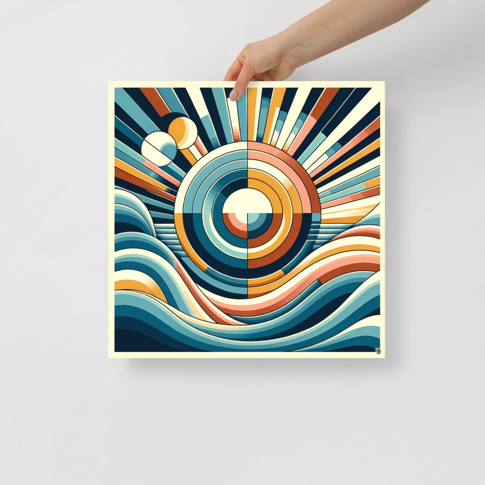 A bold geometric sun rises over layered ocean waves, built from concentric circles and radiating beams. The palette mixes teal, navy, mustard and coral for a crisp retro-modern feel. Clean shapes and strong contrast give it an abstract type-inspired, bold typography energy without using letters.
