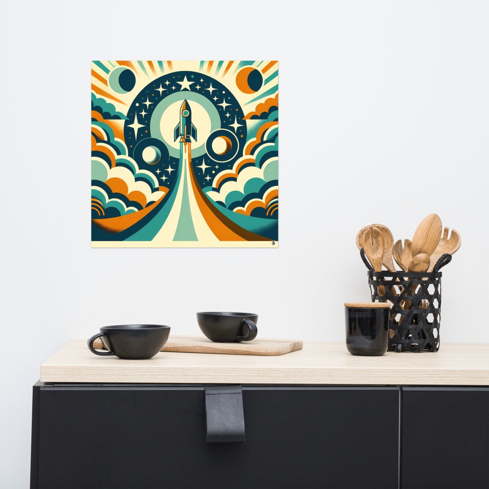 A bold rocket blasting through layered clouds into a starry sky, framed by circular planets and radiating sunburst lines. The palette mixes teal, navy, cream and orange with halftone texture and thick outlines. Designed in a sticker style flat illustration look with clean, simple vector shapes.