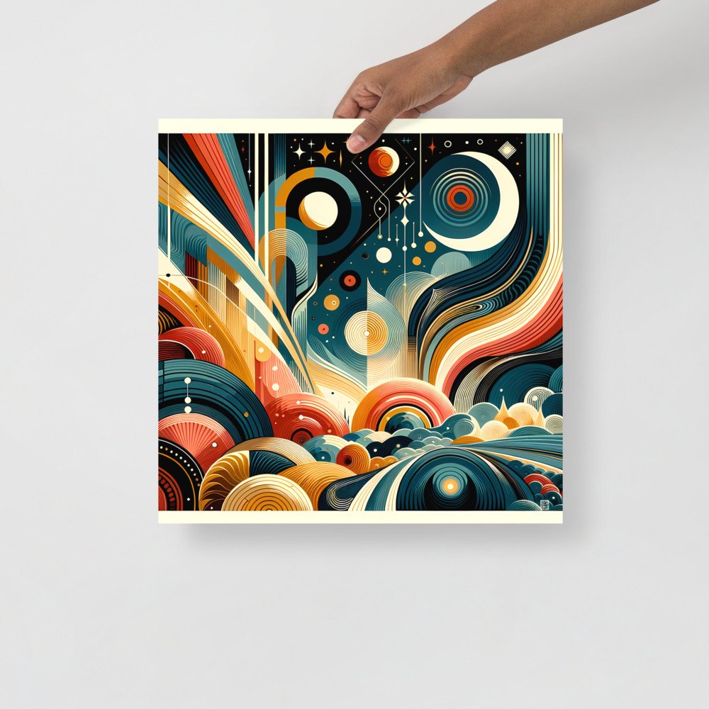 Printed on substantial matte archival paper, this poster captures every detail of the swirling abstract waves and dotted orbits. The vintage poster feel and balanced teal-and-orange palette make it ideal for framing and display.