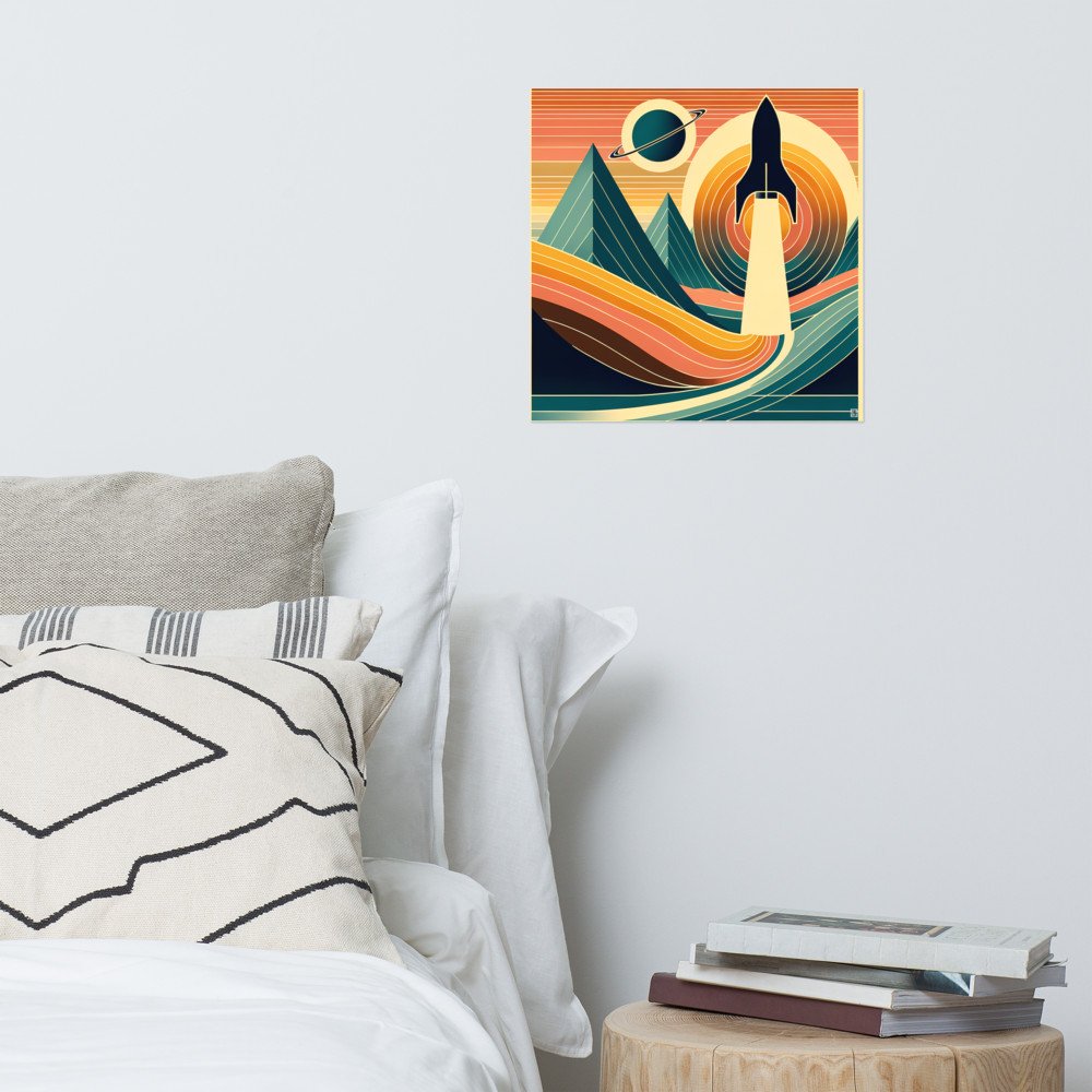 Retro Rocket Launch Over Geometric Mountains — Poster