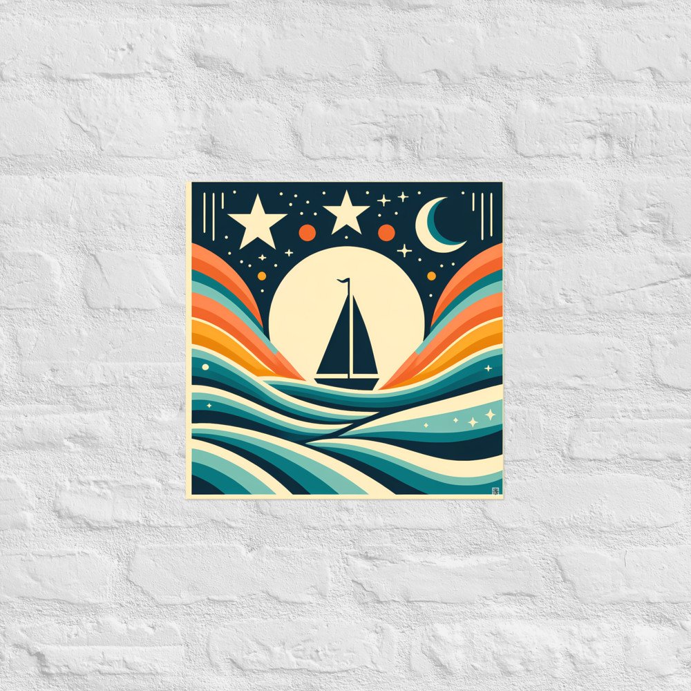 A stylised sailboat silhouette glides across layered, flowing waves beneath a starry night sky with a crescent moon. Bold geometric shapes and a soft gradient colour fade create a modern abstract art feel. The palette blends teal, navy, cream, and warm orange in a clean, poster-like composition.