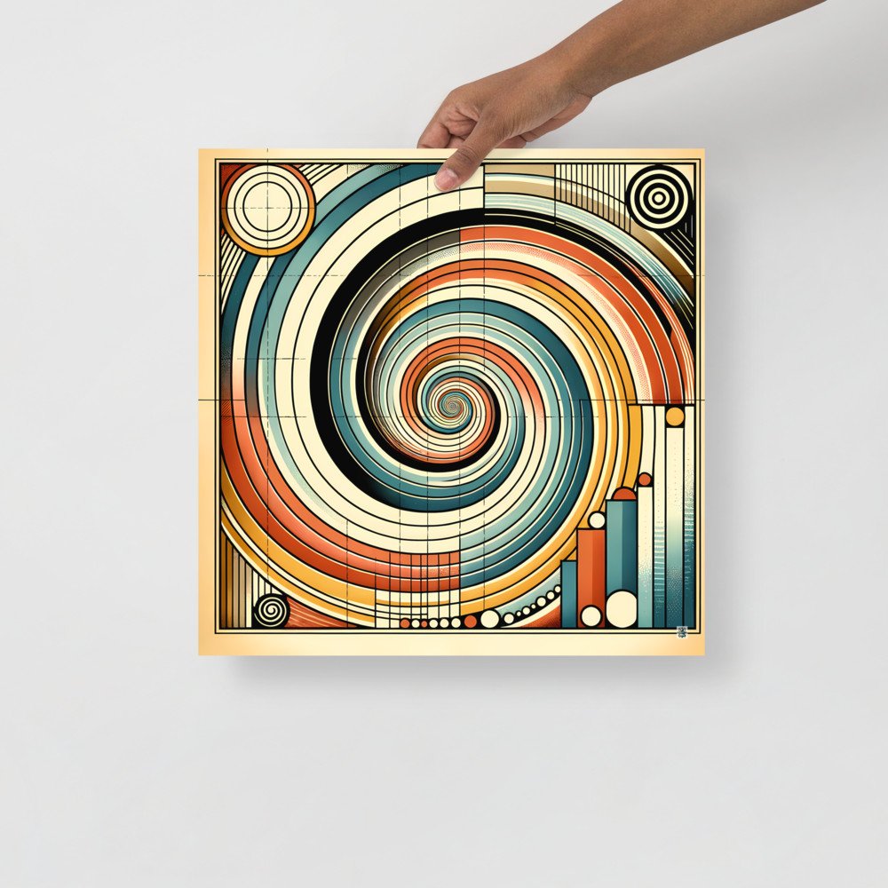 Retro geometric abstract spiral art with concentric curves and a bold mid century modern feel. Teal, burnt orange, cream and black bands swirl into a hypnotic centre, layered with grid lines and circular motifs. Vintage-inspired composition with clean shapes and graphic symmetry.