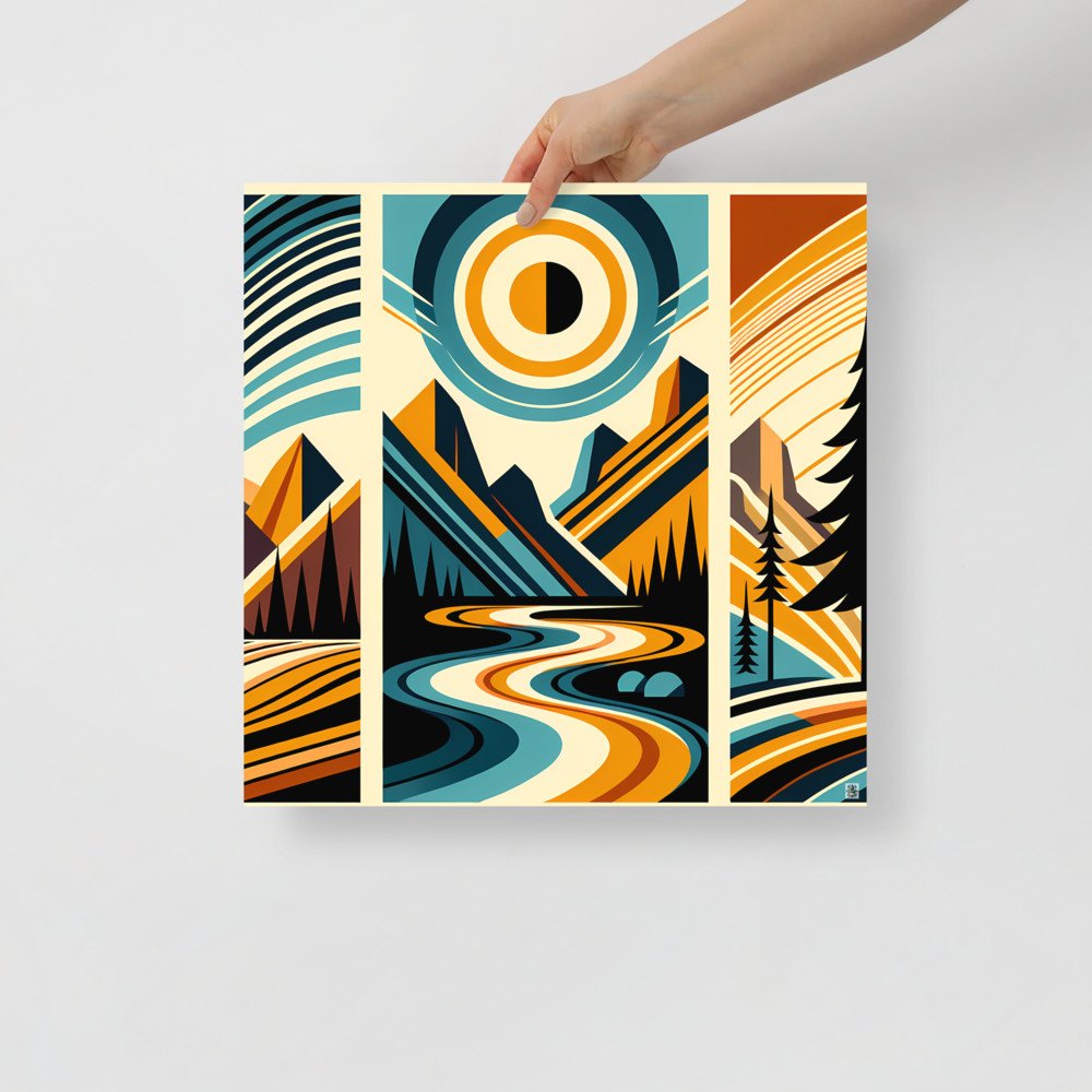 Geometric Mountain River Under Sun — Poster