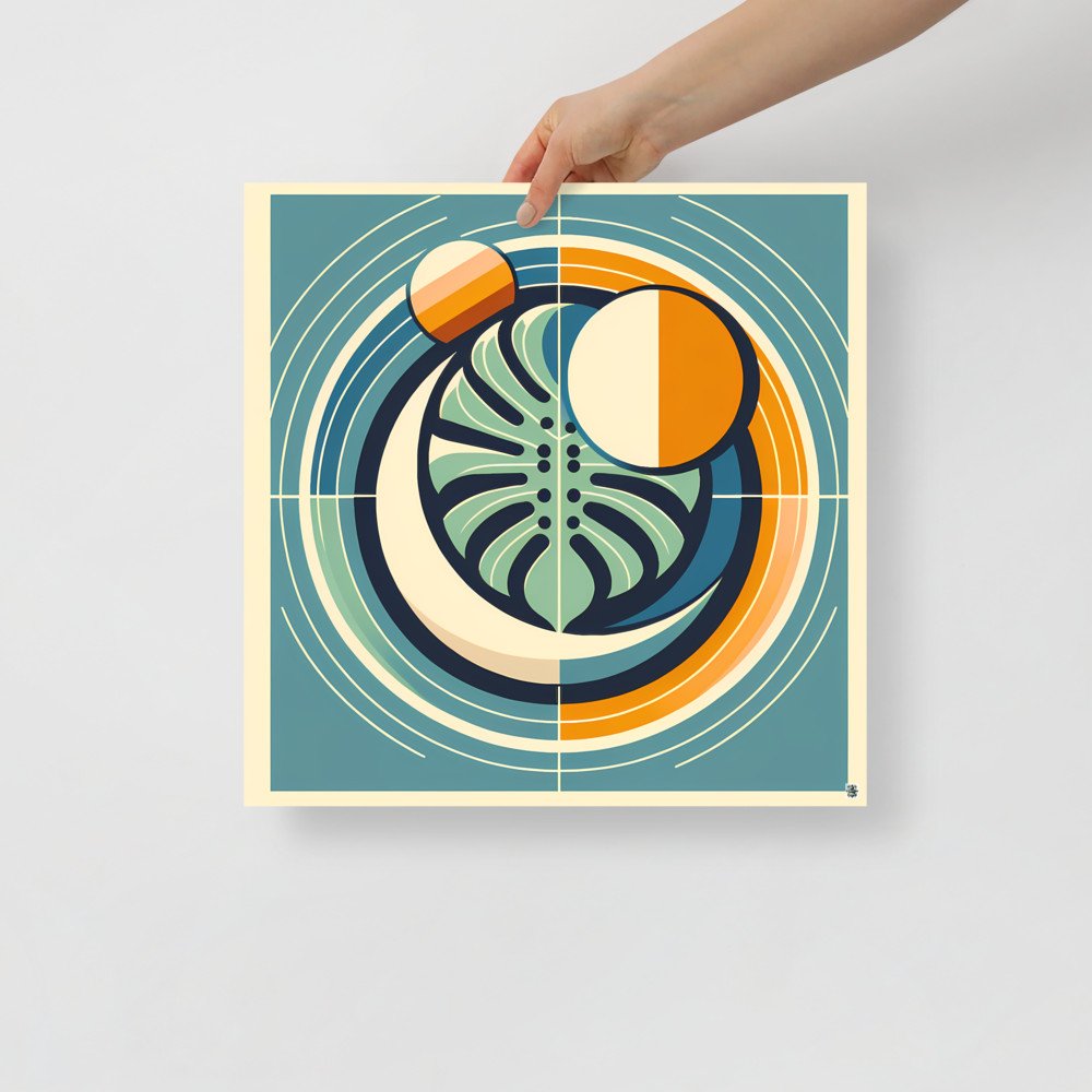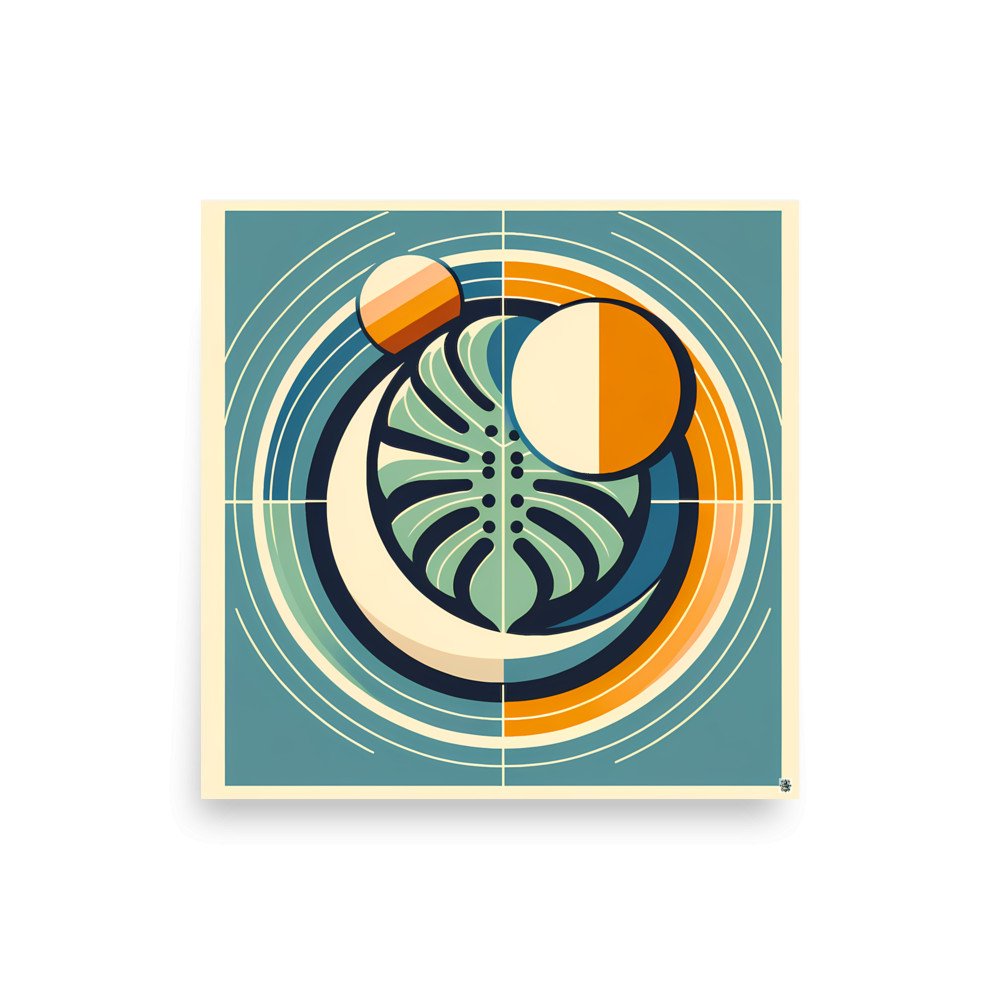 A bold abstract botanical design featuring a stylised monstera leaf framed by layered concentric circles. Split-tone colour blocking in teal, cream, and warm orange creates a balanced, modern composition. Clean lines and organic shapes give it a minimal plant art feel with a retro-inspired geometric finish.