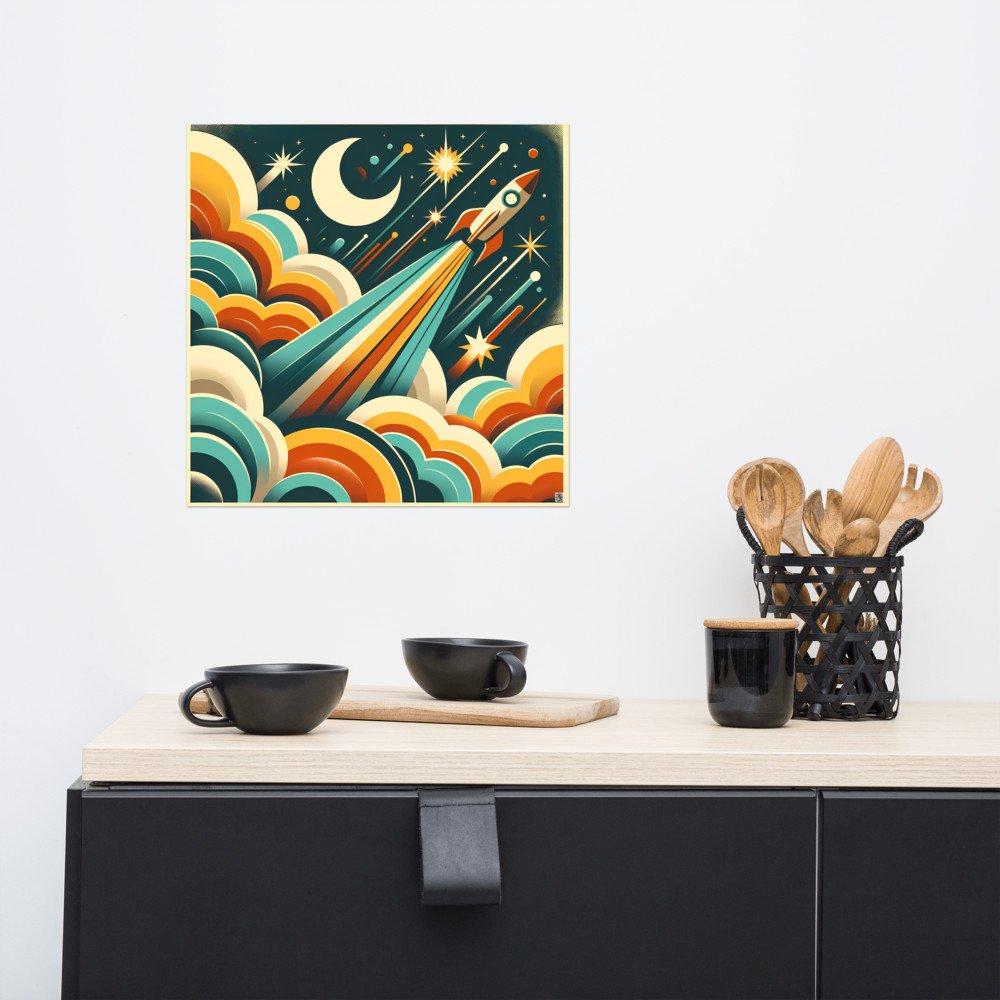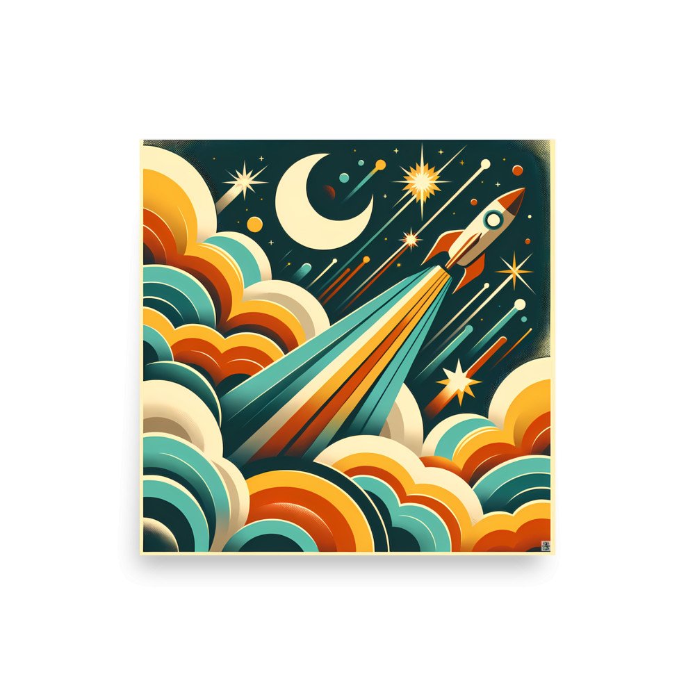 Retro Rocket Launch Through Clouds and Stars — Poster