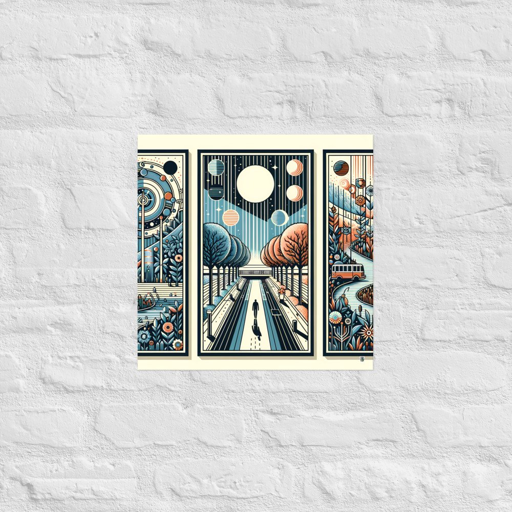Retro mid century modern cosmic landscape triptych with geometric planets, stars and a bold striped sky. Teal and orange palette frames a central road scene with trees, a lone figure and a large moon, echoing a vintage travel poster mood. Abstract space and nature illustration with clean linework, symmetrical composition and graphic shapes.