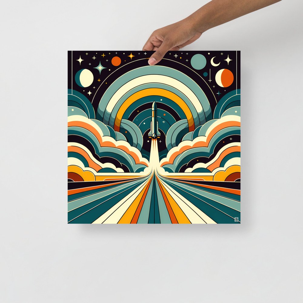 Retro Rocket Launch Through Geometric Clouds — Poster
