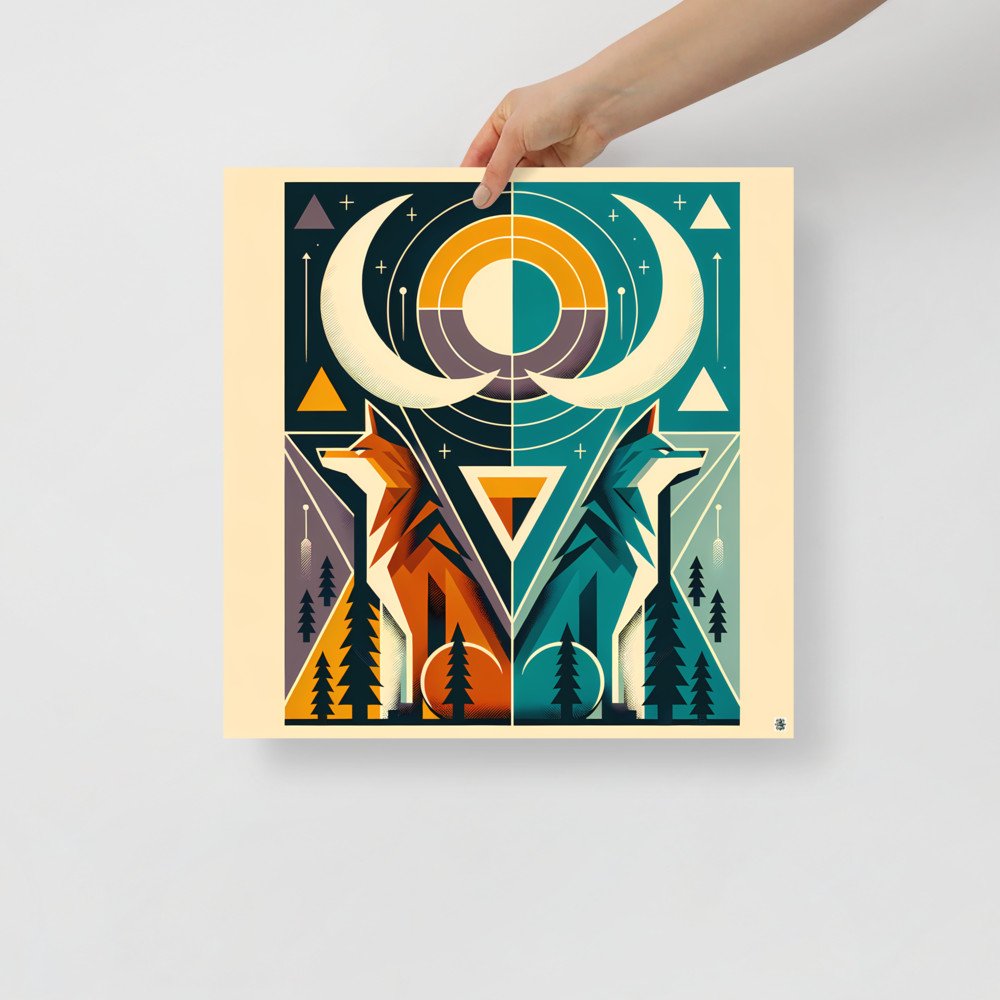A symmetrical geometric animal composition featuring a fox and wolf beneath crescent forms and concentric circles. Bold polygon animal styling, sharp line work and layered shapes create a modern wildlife emblem. Teal, orange, cream and muted violet tones add a balanced abstract look with forest silhouettes anchoring the design.
