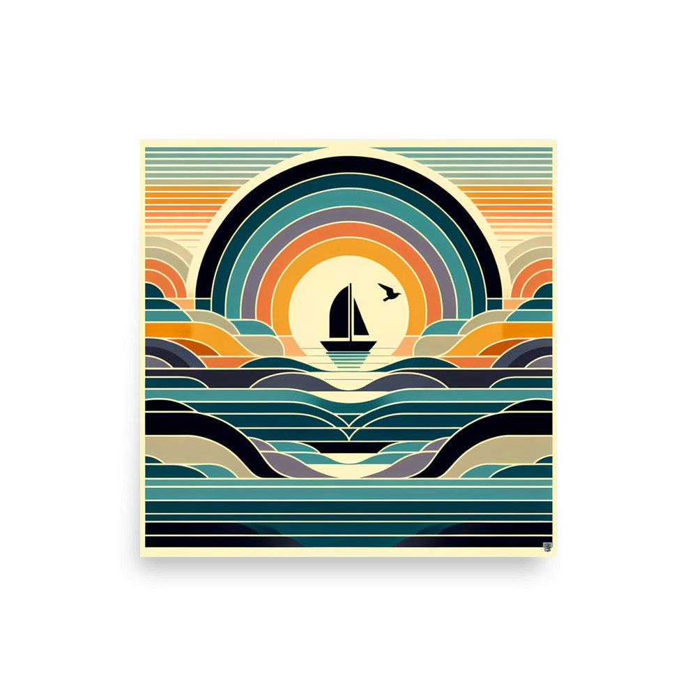 Geometric Sailboat Sunset Over Layered Waves — Poster