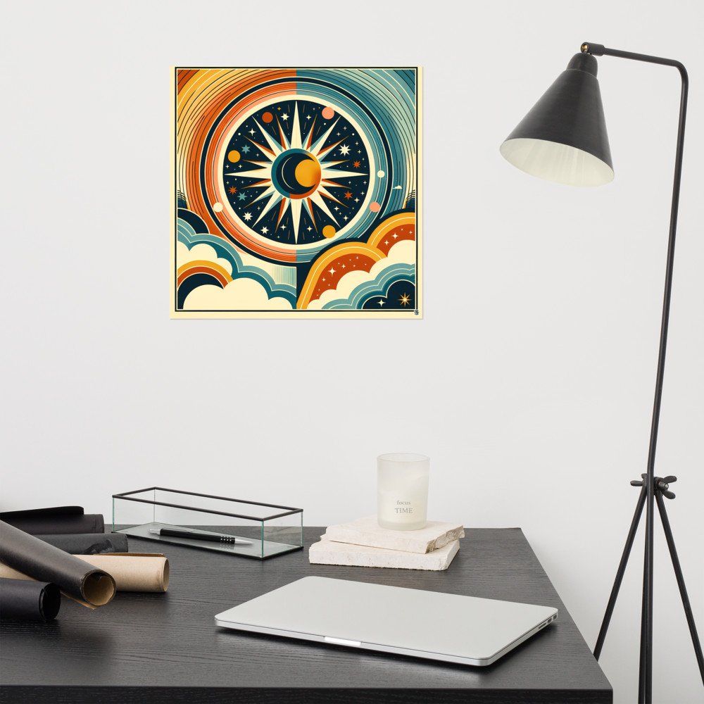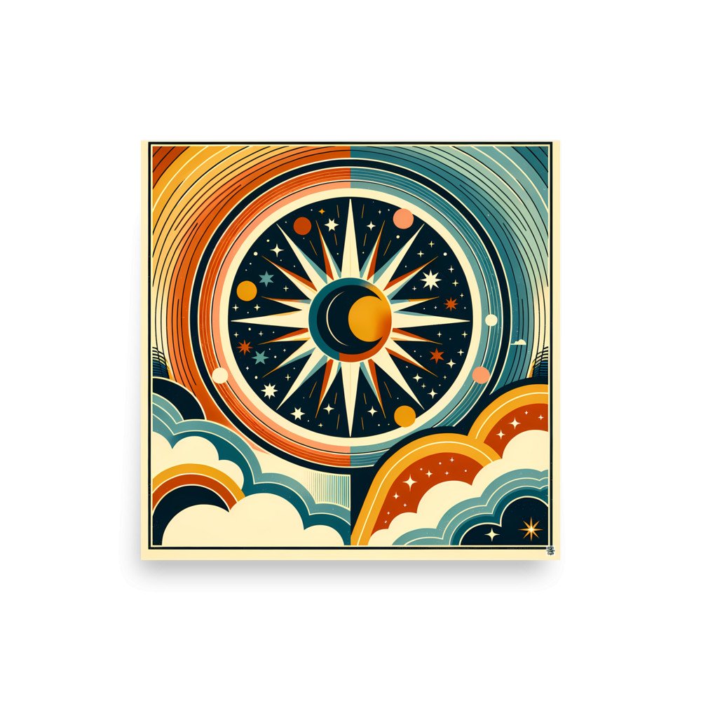 A bold celestial geometric composition featuring a crescent moon layered over a radiant sunburst, surrounded by stars and orbiting circles. Curved bands and stylised clouds frame the scene in teal, navy, cream and burnt orange, giving it a vintage cosmic line art feel.