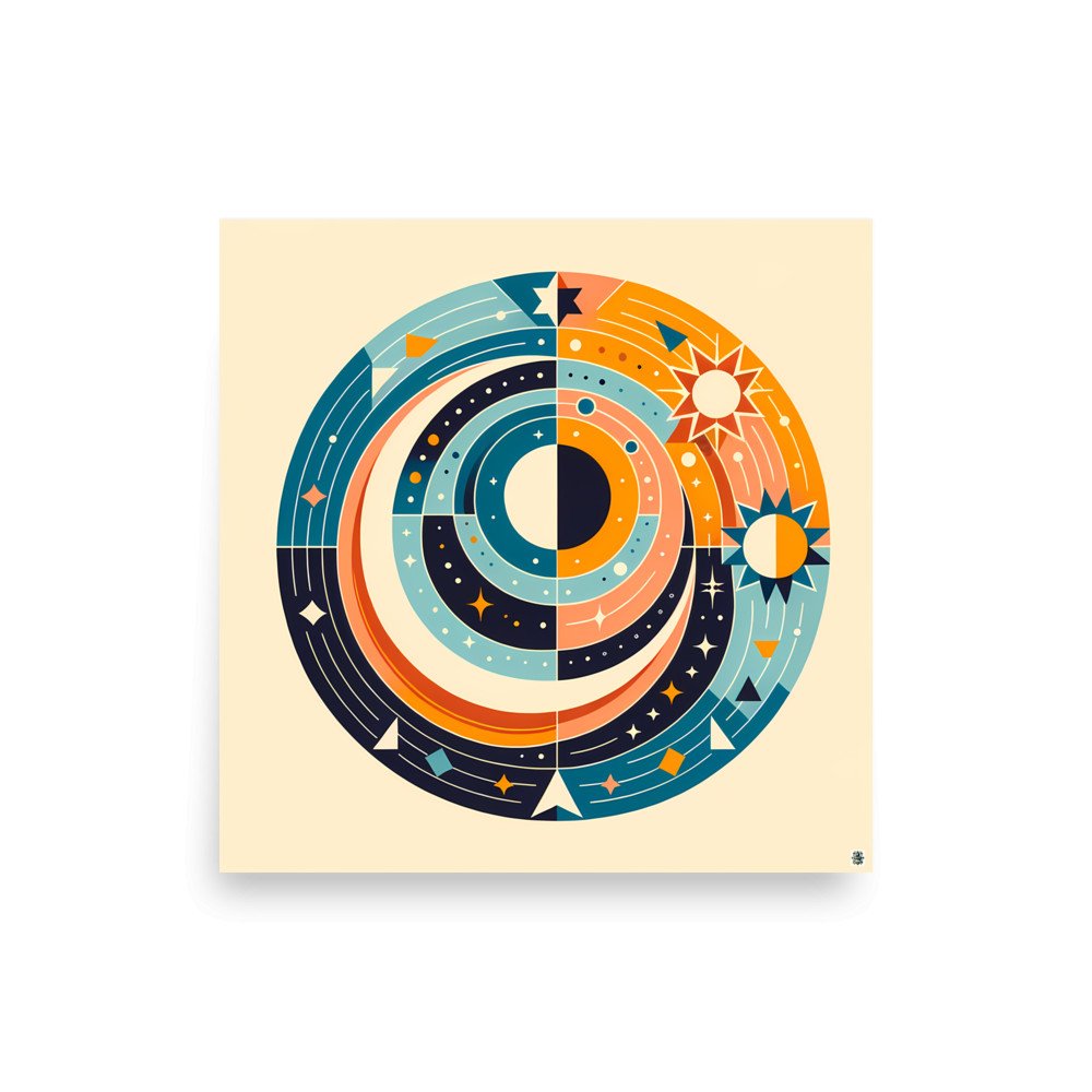 A circular celestial composition combines a split moon, radiant suns and orbiting stars in layered geometric bands. The balanced layout and bold teal, navy, peach and gold palette create a celestial minimal look with geometric moon details and abstract space energy.