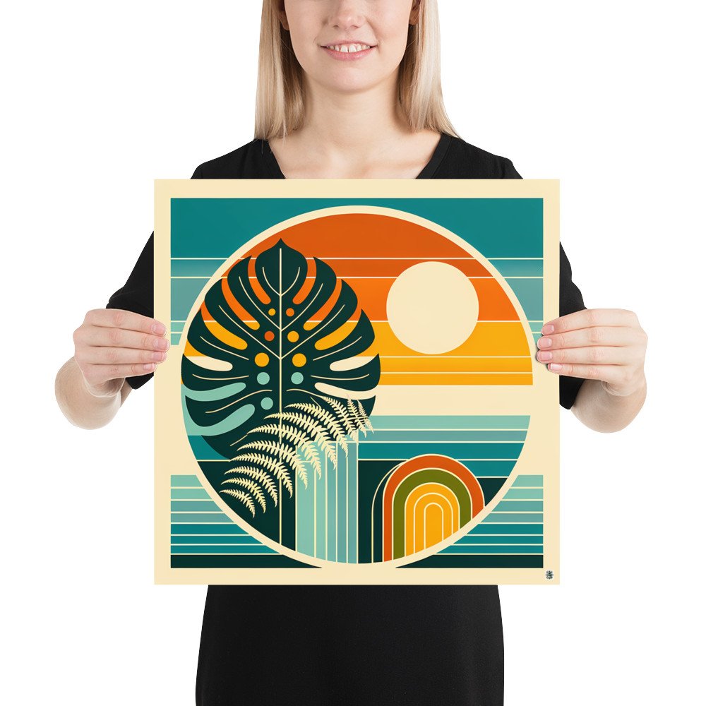 A bold abstract botanical composition featuring a stylised monstera leaf, delicate fern fronds, a glowing sun and layered geometric bands. Warm orange and cream tones contrast with teal and sage for a modern retro palette. The design blends abstract botanical shapes with minimal leaves and clean geometric structure.