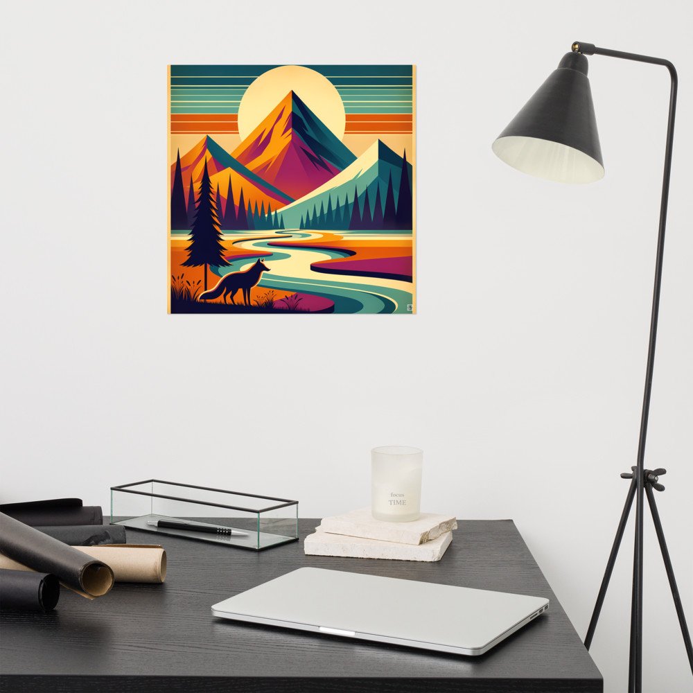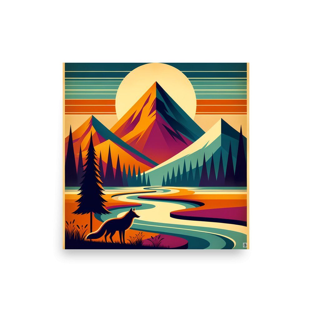 Rustic CipherGeometric Mountain Landscape with Fox and River — Poster