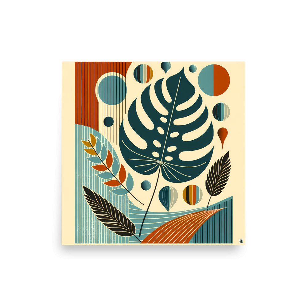 A bold abstract botanical composition featuring a large monstera leaf, layered foliage and striped geometric forms. Teal, rust and cream tones create a modern floral look with balanced organic shapes and mid-century styling.