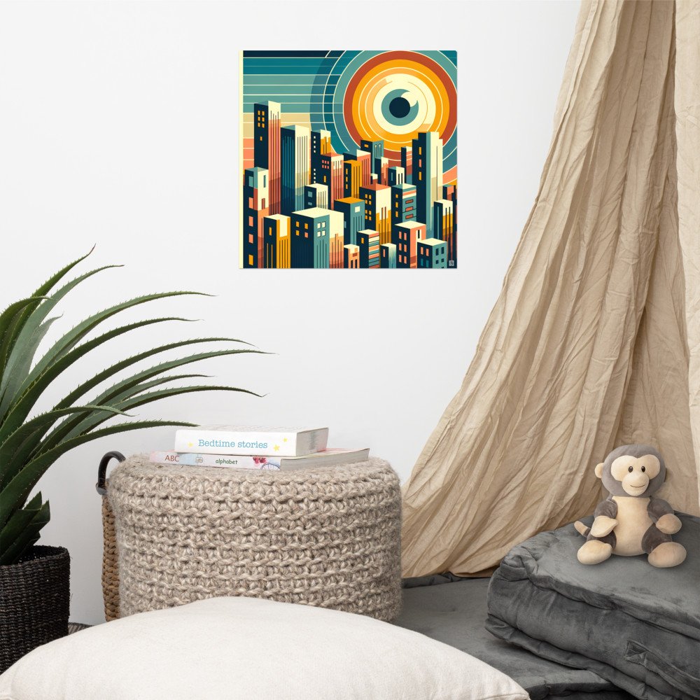 Geometric Cityscape with Circular Eye Sun — Poster