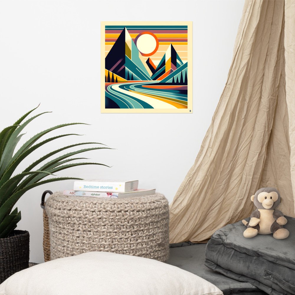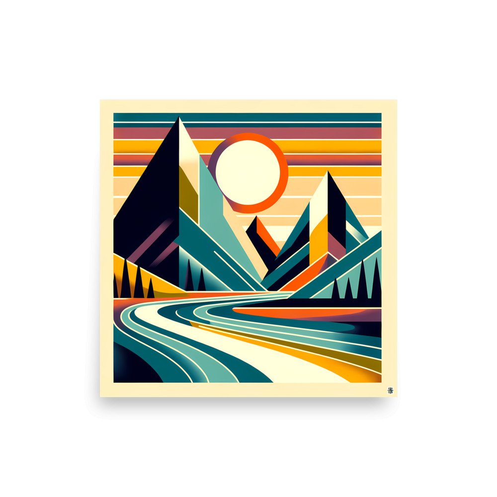 A stylised geometric landscape featuring sharp mountain forms, a large glowing sun and a winding river in bold retro colours. Clean lines and layered shapes create an abstract mountains composition with a strong minimal mountains feel. Teal, cream, orange and deep navy tones give the scene a striking vintage-inspired finish.