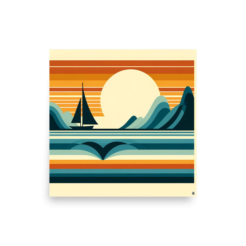 A stylised sailboat glides across calm water beneath a large sun, framed by layered mountains and striped skies. Warm orange bands contrast with cool teal reflections in a clean, geometric composition. The balanced shapes and muted palette echo scandi minimalist and nordic design influences.