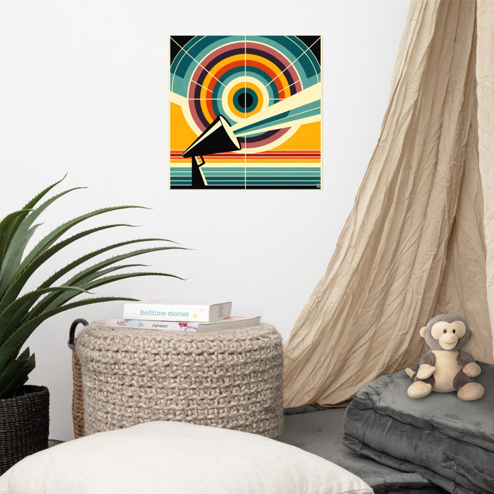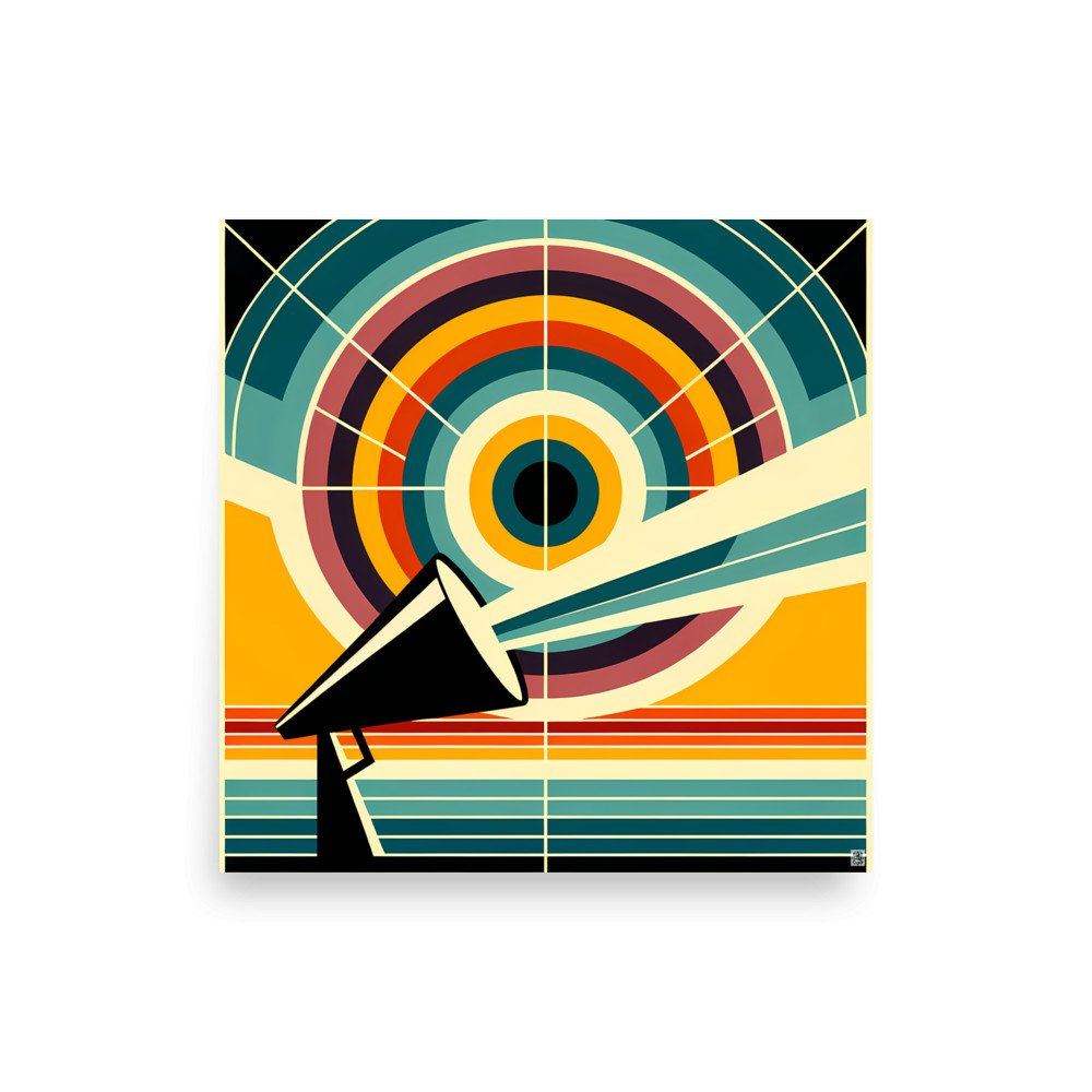 A black megaphone projects a bold beam across concentric circles and radiating lines in a striking retro palette. The composition blends bold typography energy with geometric letters styling through layered arcs, stripes, and clean graphic shapes. Teal, cream, orange, and deep plum tones give it a crisp modern type poster feel.