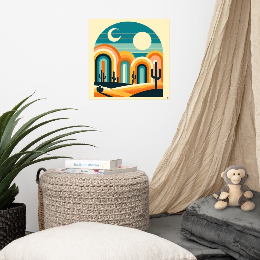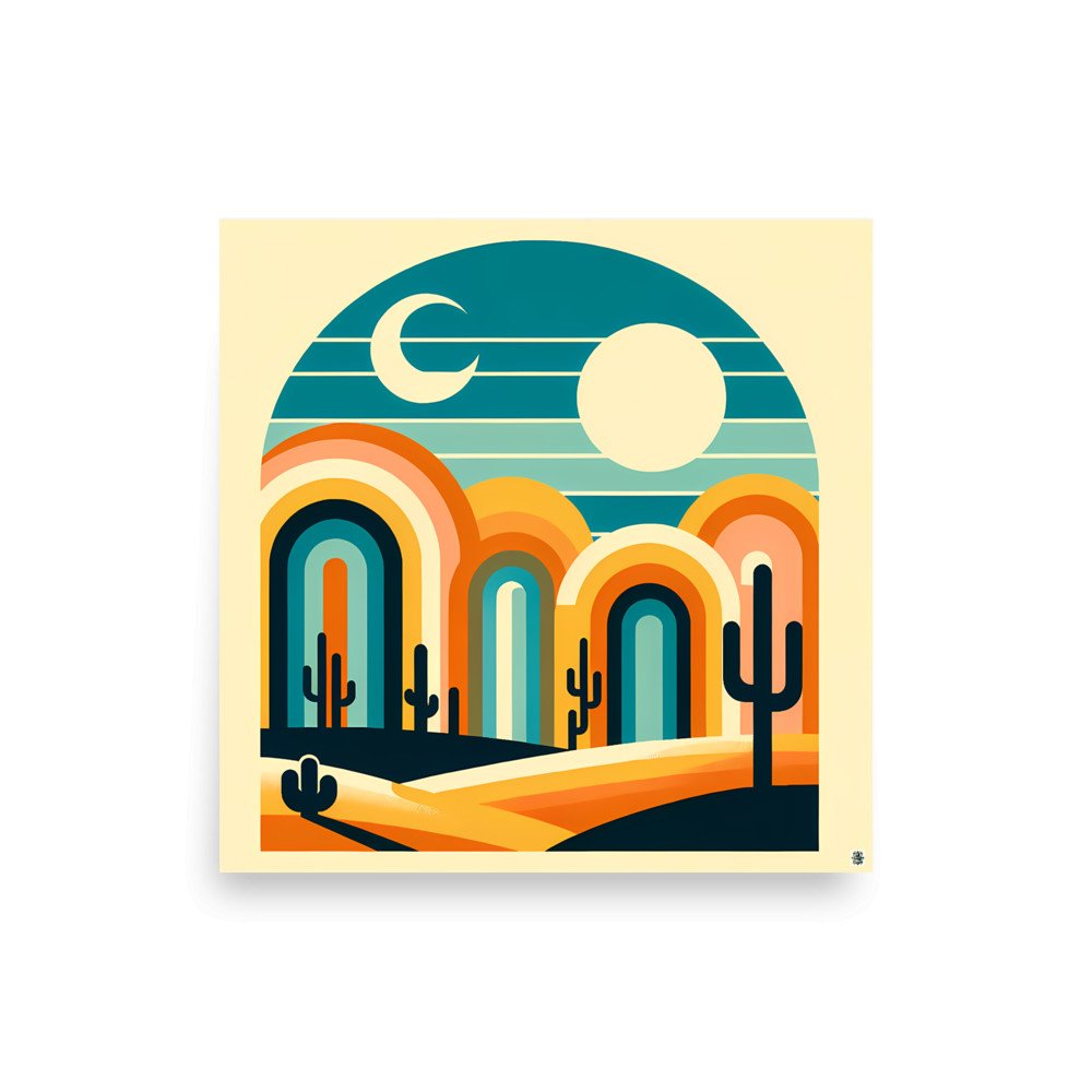 A stylised desert scene built from layered geometric arches, cacti, a crescent moon and a glowing sun. Warm orange, cream and teal tones create a bold boho minimalist look with minimal arches and a clean retro feel. The composition blends curved forms and striped skies into a striking neutral abstract landscape.