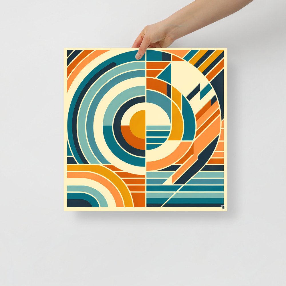 A stylised number nine is built from concentric circles, sharp angles and segmented bands in teal, navy, orange and cream. The composition blends bold typography with type and shapes, creating an abstract lettering look with a clean editorial style.