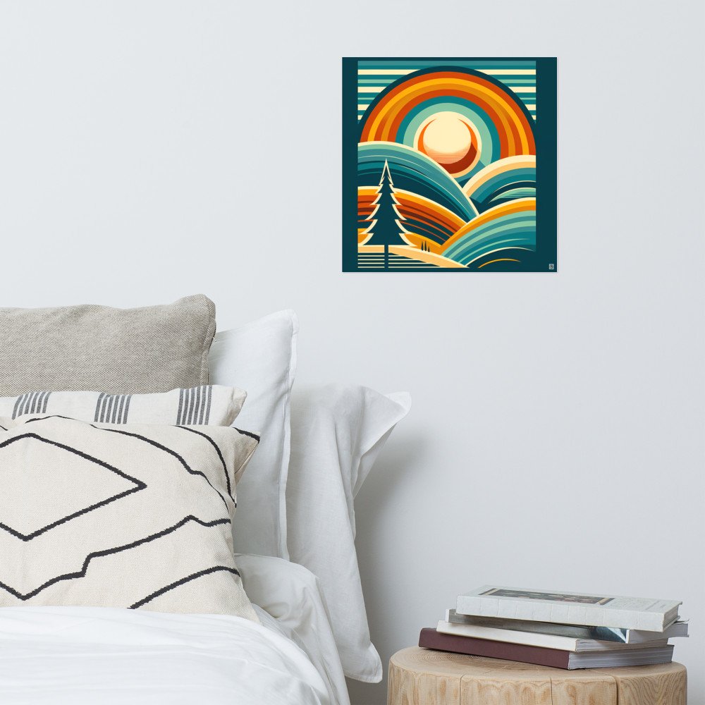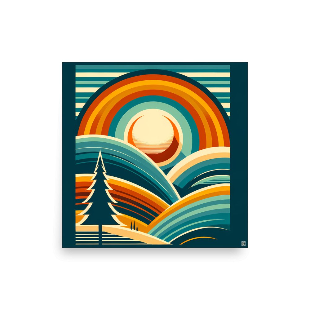 A stylised landscape of layered hills, a glowing sun and a silhouetted pine tree in teal, orange and cream. Bold curved bands and clean shapes give it a scandi minimalist feel with a modern Scandinavian palette. The composition blends retro geometry with neutral abstract balance.