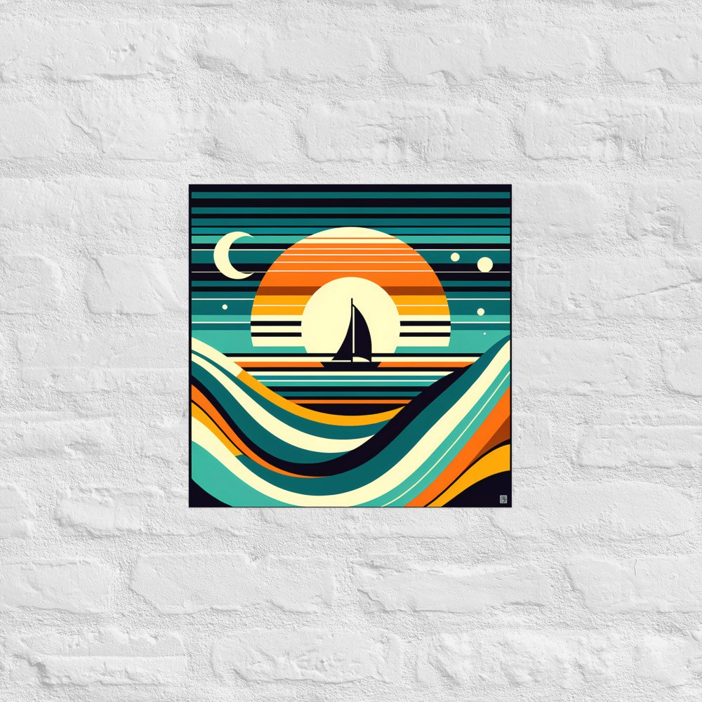 A stylised sailboat sits against a striped sunset with a crescent moon, stars and flowing layered waves. Bold teal, cream and orange bands create a geometric gradient look with a modern abstract feel. The clean lines and colour fade art influence give the scene a striking retro-futurist atmosphere.