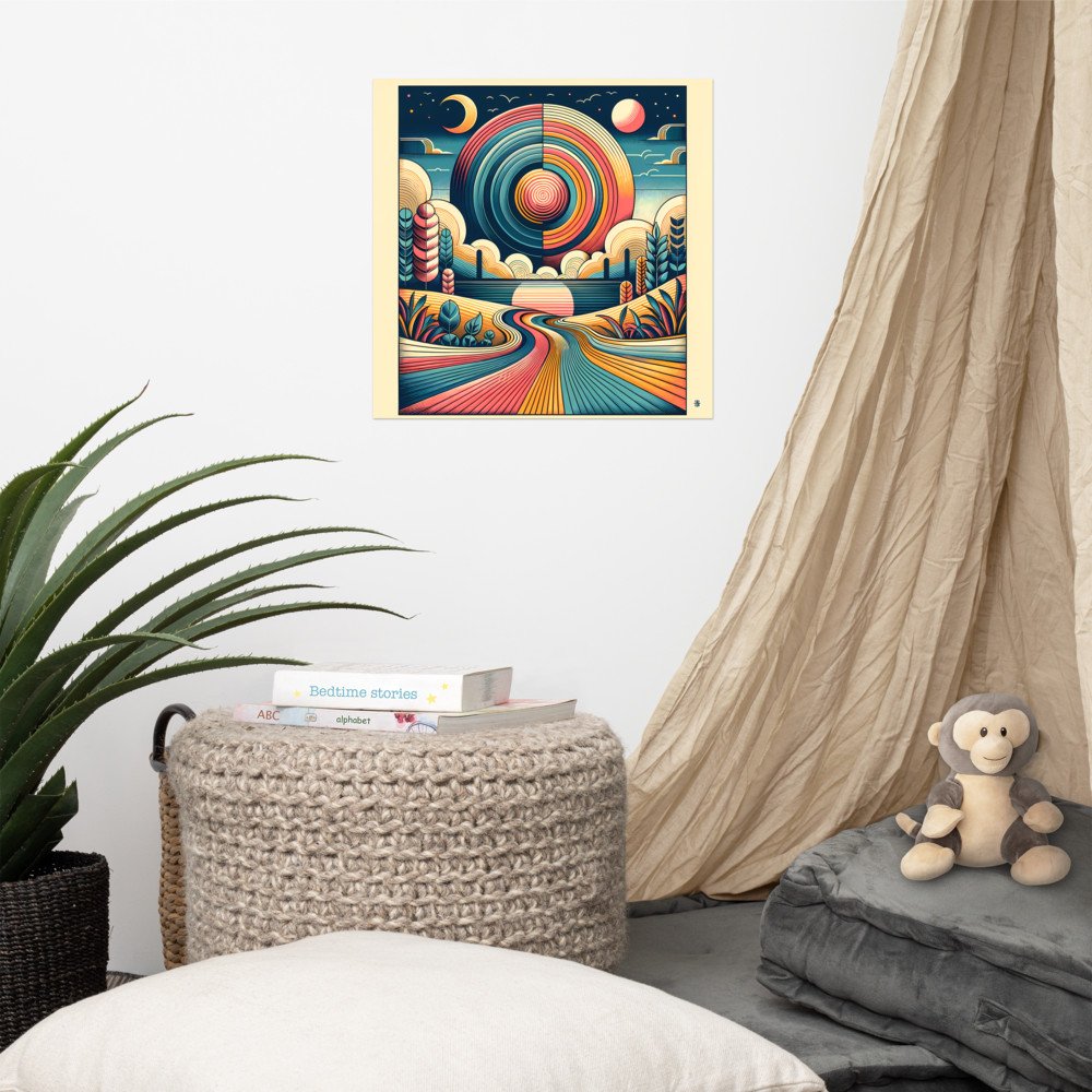 Retro Geometric Sunset Landscape with Spiral Sun — Poster