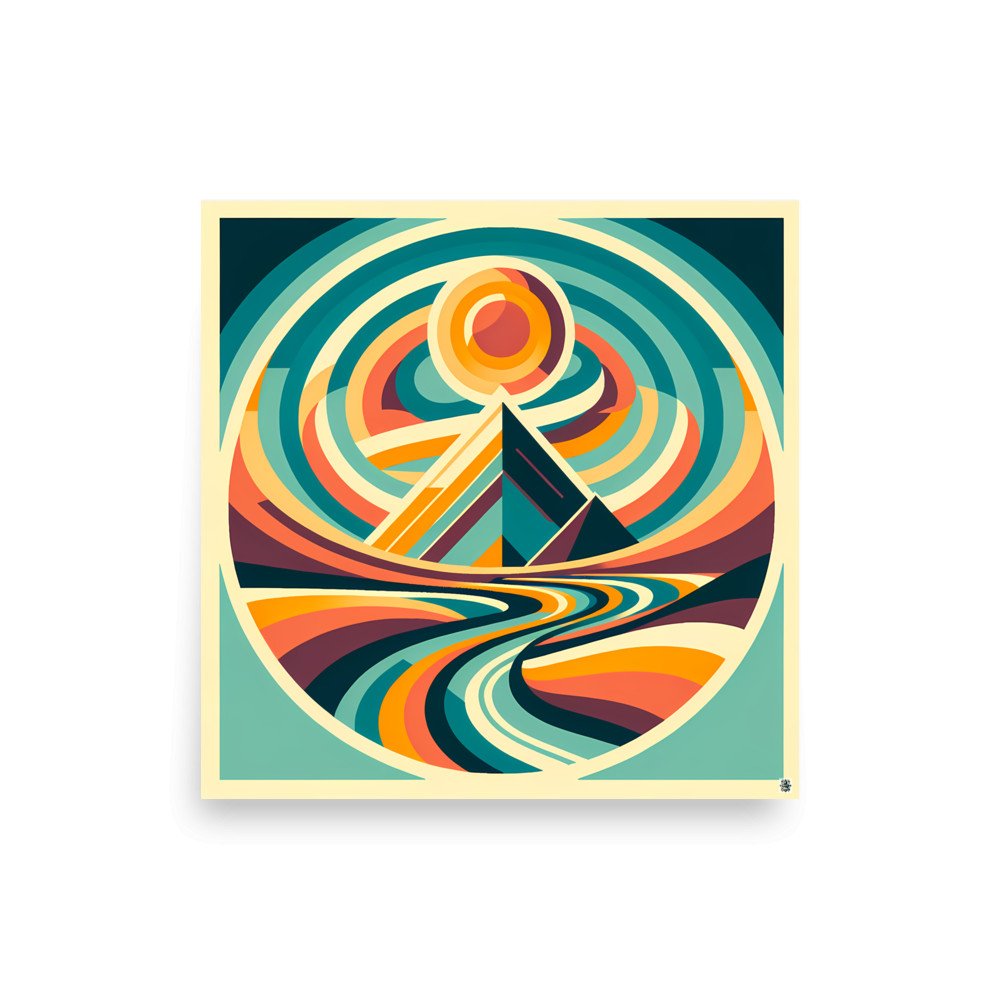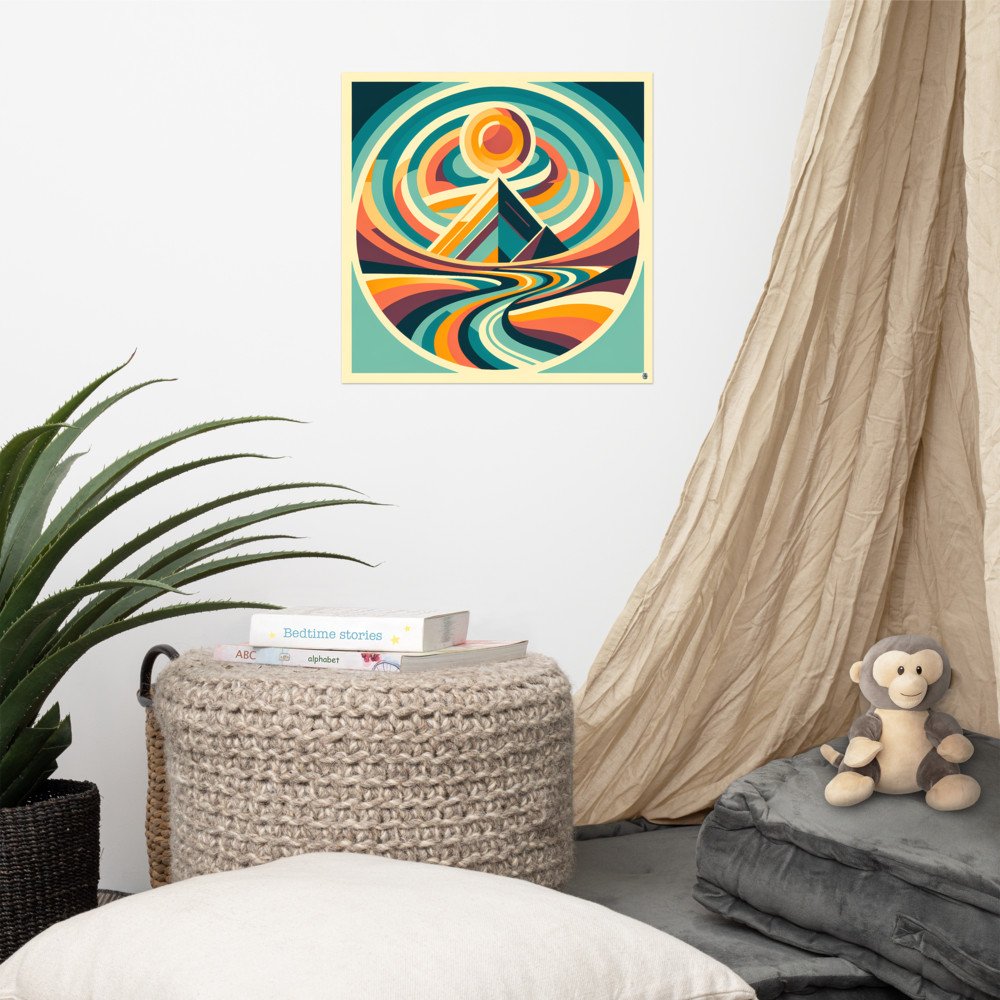A bold geometric landscape featuring layered triangle mountains, a radiant circular sun and a winding river in sweeping bands of teal, orange and cream. The composition blends minimal mountain forms with retro-inspired curves for a striking outdoor minimalist look. Clean shapes and nature geometry create a vivid, balanced scene.