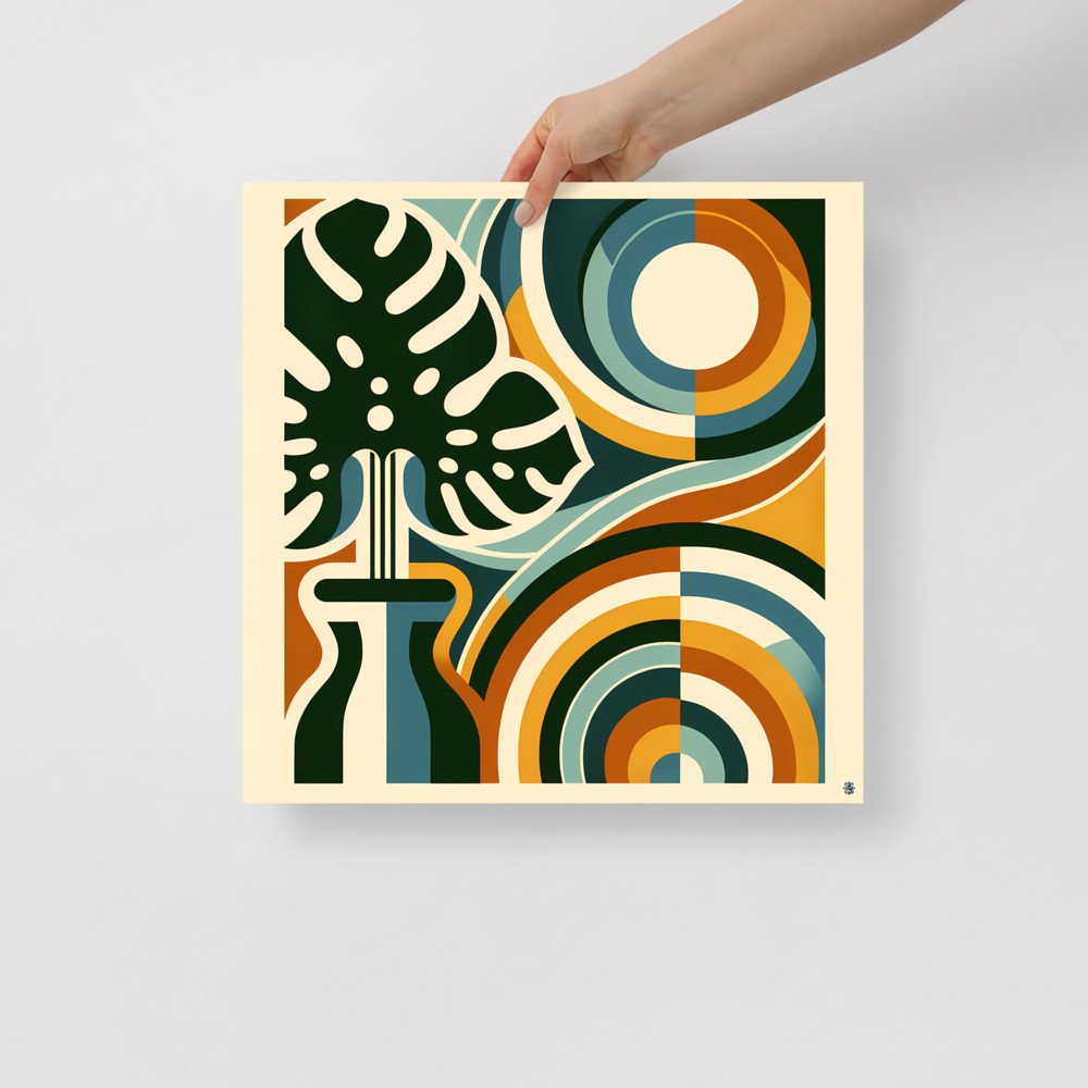 A bold abstract botanical composition featuring a stylised monstera leaf in a vase, framed by layered geometric arches and flowing organic shapes. Deep green, teal, mustard and rust tones create a modern floral look with strong retro balance. The design blends abstract botanical elements with geometric leaves for a clean, graphic finish.