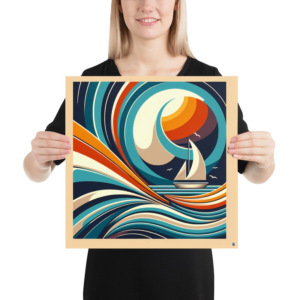An abstract sailboat moves through sweeping geometric waves beneath a glowing circular sky. Layered curves in teal, cream, orange and navy create a bold colour fade art effect with a modern abstract feel. The composition blends fluid motion with graphic shapes for a striking geometric gradient look.