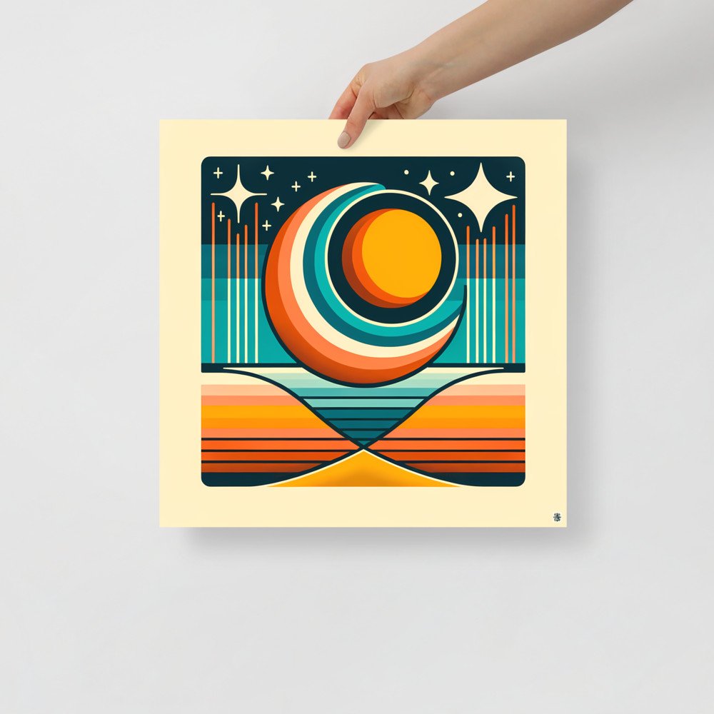 A bold celestial composition featuring a layered crescent moon wrapped around a glowing sun above a striped horizon. Clean curves, star shapes and balanced lines give it a celestial minimal look with strong solar lunar energy. The warm orange and cream tones contrast with teal and deep navy for a striking abstract finish.
