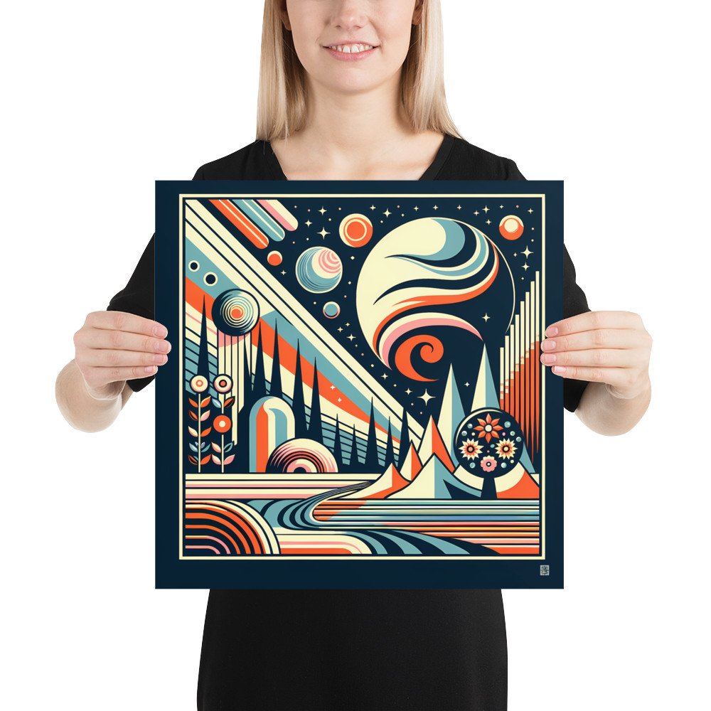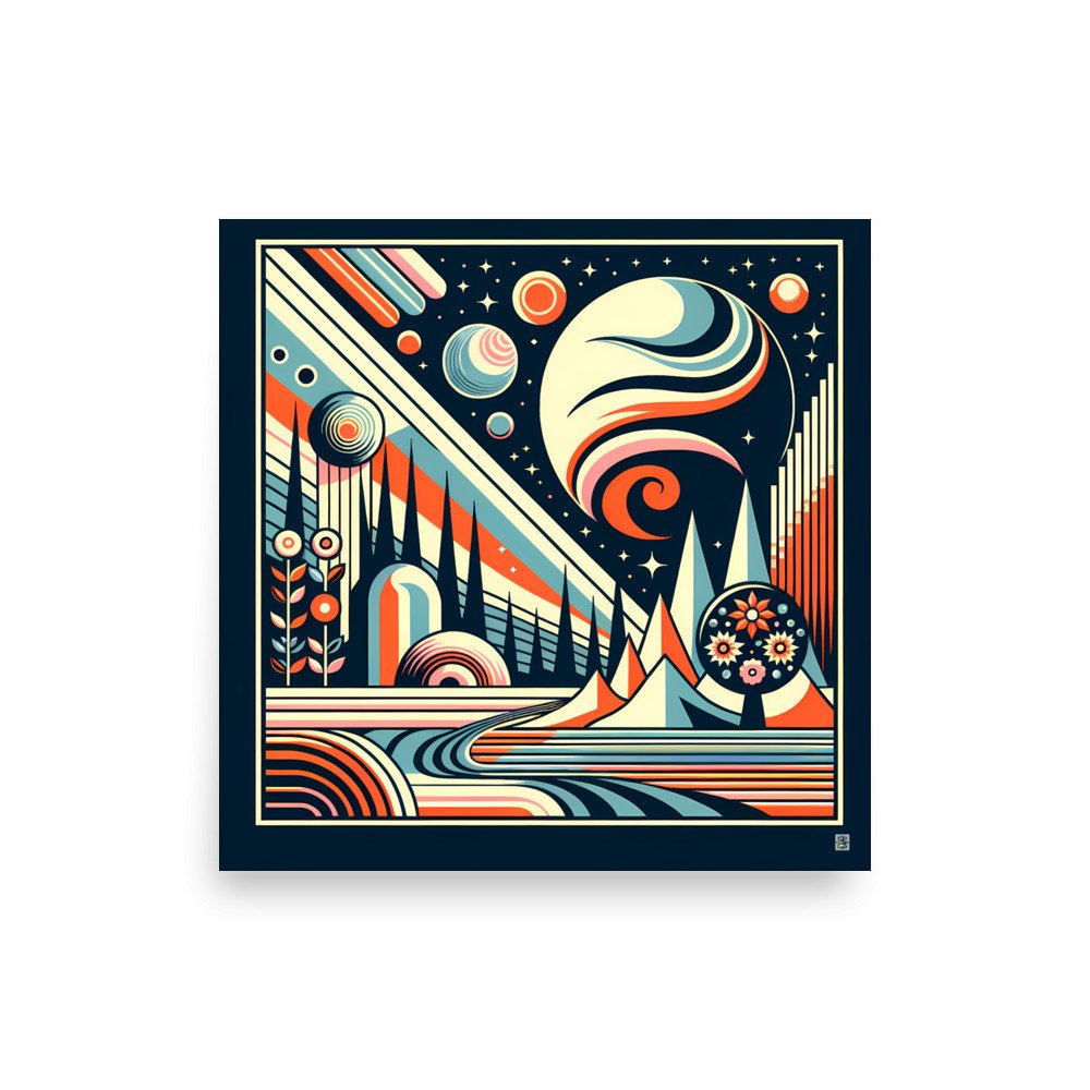Retro space landscape illustration with swirling planets, starry sky and bold mid century modern geometry. Abstract cosmic scene featuring geometric mountains, striped horizons and stylised trees in teal, cream, coral and navy. Vintage travel poster feel with clean lines, graphic shapes and a futuristic night mood.