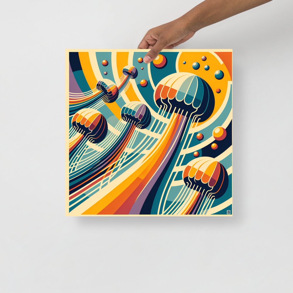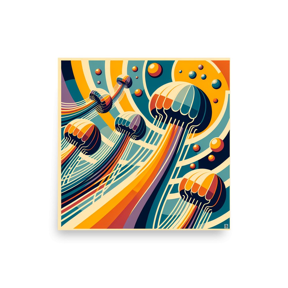 A bold digital abstract featuring stylised jellyfish drifting through sweeping geometric curves and layered gradient waves. Cream, teal, orange and navy shapes create an op art feel, with flowing ribbons and floating spheres adding a modern psychedelic rhythm.