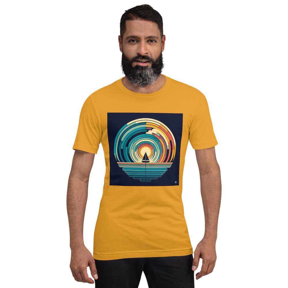 A stylised sailboat silhouette sits on layered waves beneath a glowing sun. Concentric arcs form a bold, retro-inspired sky with a small cloud detail. The palette blends teal, cream, mustard, and coral on a deep navy background.