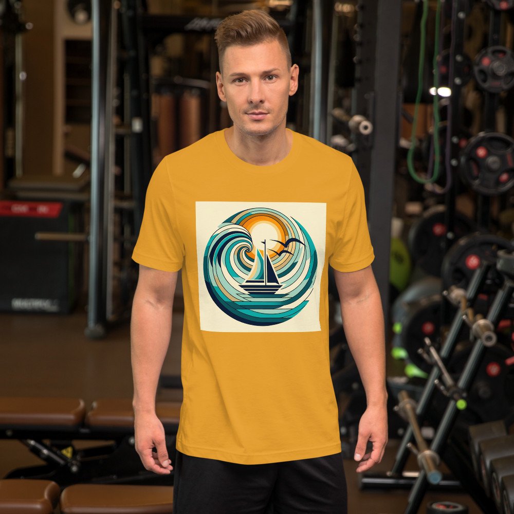 Minimal Sailboat in Abstract Wave Circle — T-Shirt