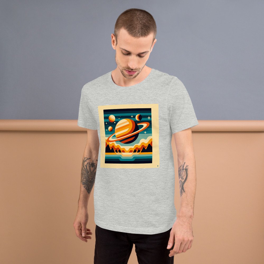 Retro Ringed Planet Over Mountains — T-Shirt