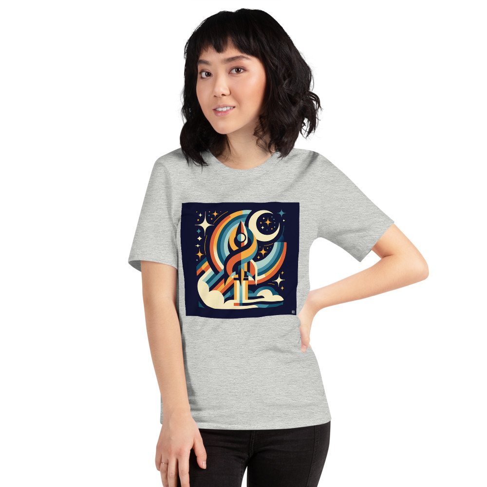 Retro Rocket Launch with Rainbow Trails — T-Shirt