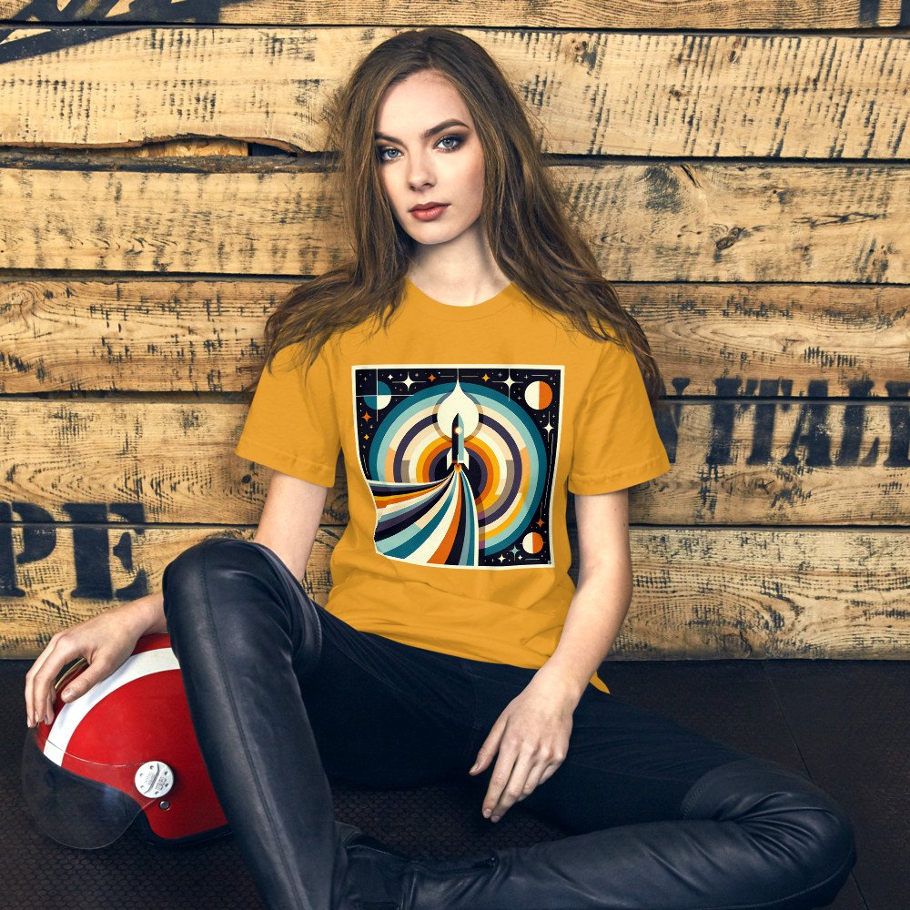 The relaxed fit of this premium cotton tee offers everyday comfort, featuring the stylised rocket launch across its front. Crisp, concentric rings and a mid-century colour palette give the graphic its distinctive retro appeal.