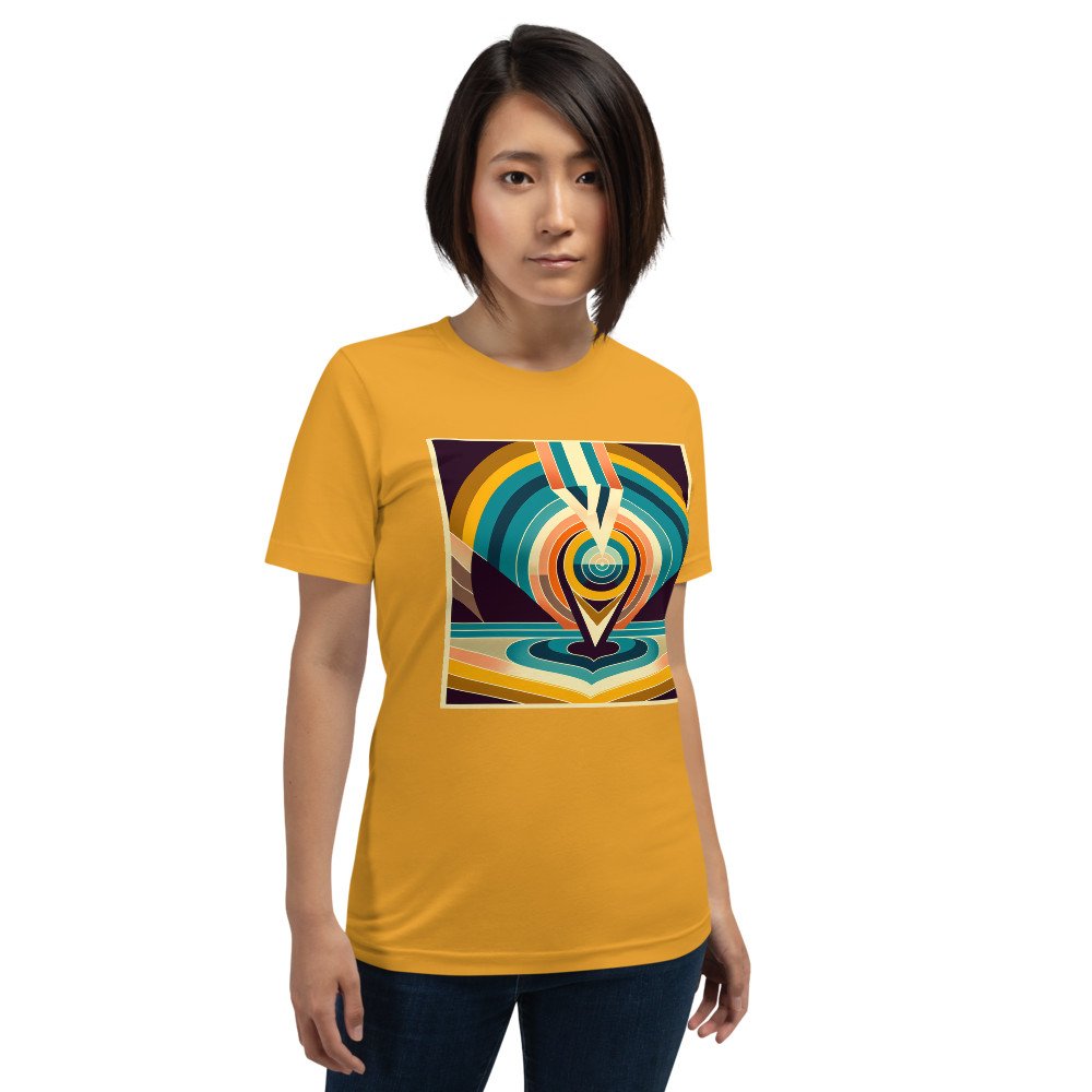 A bold letterform V sits at the centre of layered concentric circles and mirrored geometric bands. The palette blends teal, mustard, cream, coral and deep plum with crisp symmetry and depth. A bold typography composition with typographic geometric shapes and a clean, modern poster feel.