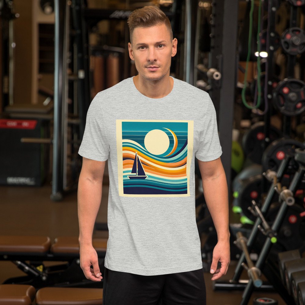 This relaxed-fit cotton tee carries the serene coastal scene with comfort. Crisp lines and a gradient of teal to orange give the geometric sailboat design a clean, modern look that’s subtle yet distinctive for everyday wear.