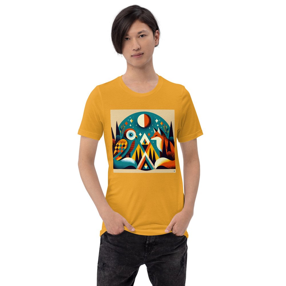 Geometric Owl and Fox Under a Moonlit Sky — T-Shirt