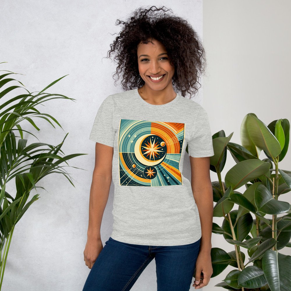 Geometric Crescent Moon and Starburst Orbit — T-Shirt