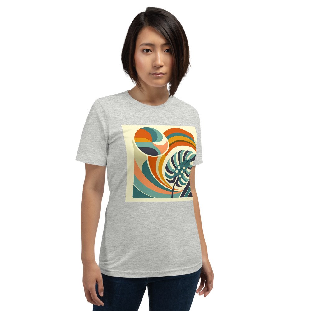 Abstract Monstera Leaf with Retro Rainbow Waves — T-Shirt