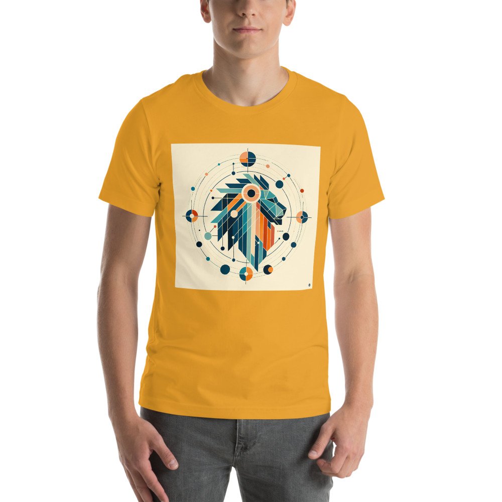 A geometric lion head is built from sharp angular shapes, orbital circles and balanced linework in teal, navy and orange. The composition blends a minimal zodiac aesthetic with celestial pattern details, creating a bold astrology symbol with a precise modern structure.