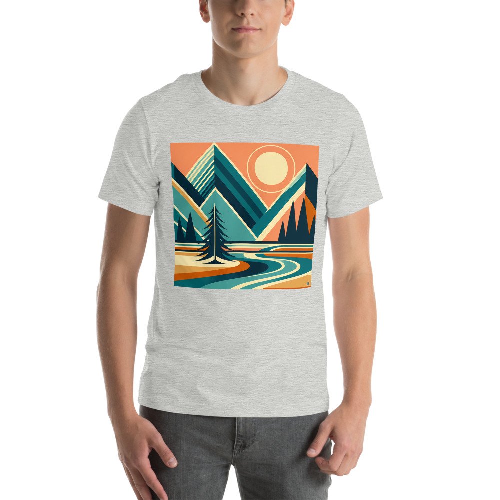 A stylised alpine scene with layered geometric mountains, a circular sun and a winding river in bold retro tones. Sharp triangular forms and clean bands of colour create a striking triangle landscape with strong line mountain details. Teal, cream and burnt orange shapes give the composition a crisp minimal outdoors feel.